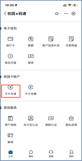 1、校园卡充值方法:以上第二步校园E码通实名认证和绑定完成后,在微信或支付宝进入“校园E码通”小程序,点击“校园卡账户”下的“卡片充值”,输入充值金额及对应的验证码后完成充值。如下图: